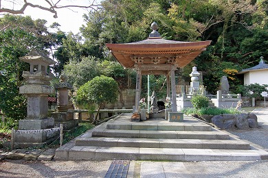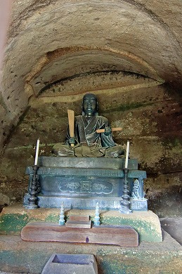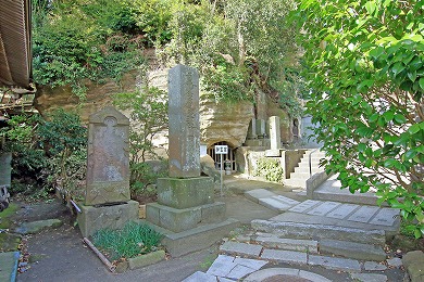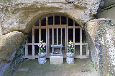龍ロ法難の際、幕府に捕らえられた日蓮大聖人様がへの一晩幽閉されたと、伝えられる洞窟。 (説明板より)