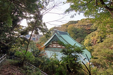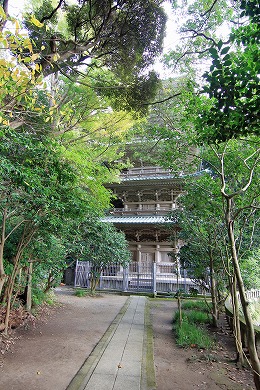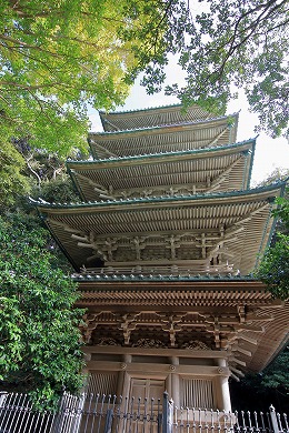 龍口寺の五重の塔は明治四十三年(1910)竣工、棒造り銅板葺き、神奈川県で唯一の木造本式五重塔である。初層の上部には彫刻師、永田伊助の手になる日蓮大聖人御一代記が奉納されている。