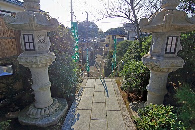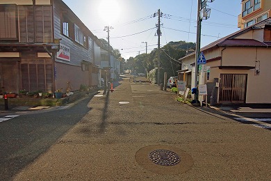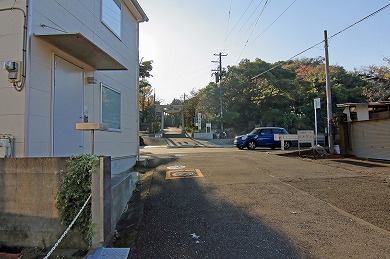 (踏切を渡り)真っ直ぐ、道路を横断し、正面斜め右の道に入ります。