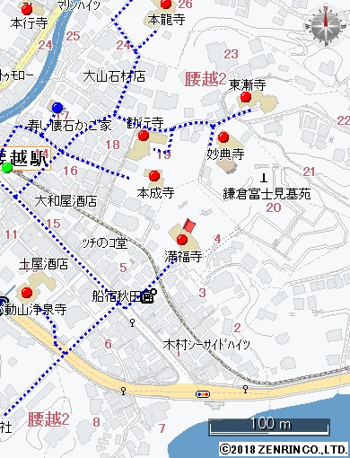 開山は行基(668~749)と伝えられ、本尊は薬師如来です。源義経(1159~1189)が腰越状を書いた所として有名です。境内には弁慶が墨をするのに水を汲んだといわれる硯池、腰掛石があります。(案内板より)
