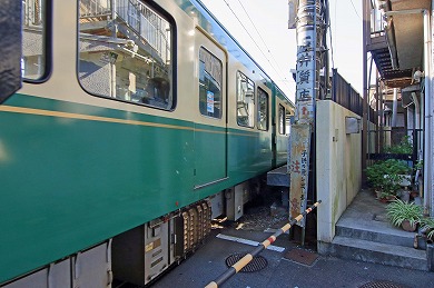 右が腰越駅ですが、駅に停車中、踏切はしまっています。(電車がホームをはみ出しているため)