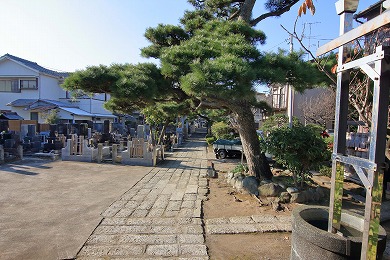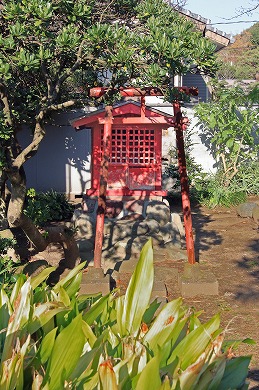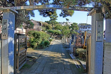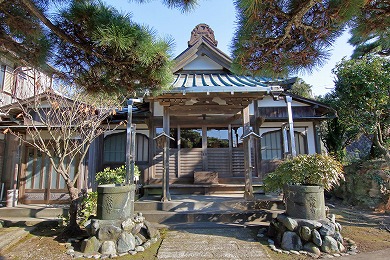 門を入った正面に本堂があり、右側に墓地、左側に庫裏(くり)があります。日蓮(にちれん)の弟子日賢(にっけん)が1309年(延慶2年) に開いたと伝えられています。本尊は、三宝本尊(さんぽうほんぞん)(祖師(そし))という「南無妙法蓮華経(なむみょうほうれんげきょう)」のお題目が書かれた塔と釈迦如来(しゃかにょらい)、多宝如来(たほうにょらい)で、日蓮上人像とともにまつられています。また、岩の上のキッネにまたがった稲荷明神像(いなりみょうじんぞう)もありますが、これは「教(経)-稲荷」と呼ばれ、左手に宝珠(ほうじゅ)を持つ江戸時代のものです。