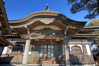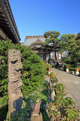 この寺は、輪番寺の中で日蓮宗(にちれんしゅう)の寺としては最も早く建てられたものです。山門を入った正面の本堂には、田辺ガ谷(たなべがやつ)の雨乞(あまご)いの日蓮上人像や大黒天、鬼子母神(きしぼじん)、