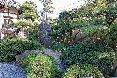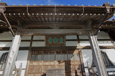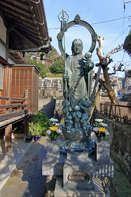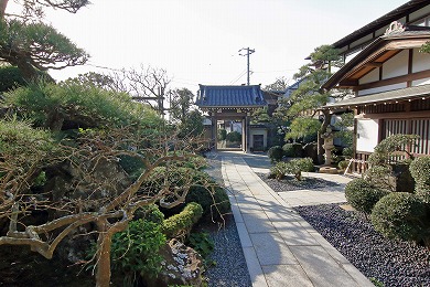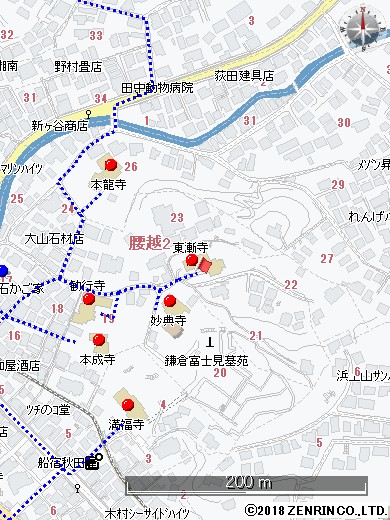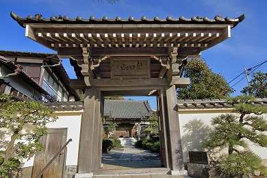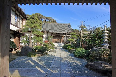 山門をくぐると正面に本堂があります。この寺は、龍口寺を守るために千葉県中山の法華経寺(ほっけきょうじ)から差し向けられたといわれる日東(にっとう)が1352年(正平7年)に開いたと伝えられます。本堂には、日蓮上人(にちれんしょうにん)像と釈迦如来(しゃかにょらい)像がまつられています。「腰越駅」近くの諏訪神社は、もとはこの寺の境内にあったそうです。寺の裏山には、エフェドリンという咳止めの薬を作り、日本薬学の基礎を築いた長井長義(ながいながよし)博士夫妻の墓がありましたが、現在は墓は移され、墓地に記念碑が立っています。この寺の近くには妙典寺(みょうてんじ)、勧行寺(かんぎょうじ)、本成寺(ほんじょうじ)、本龍寺(ほんりゅうじ)があり、輪番八ヵ寺のうち五寺が集まっています。昔は、この谷戸あたりが腰越の中心部だったそうです。