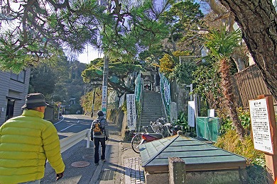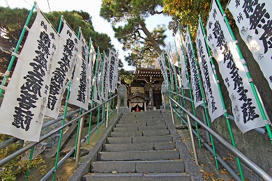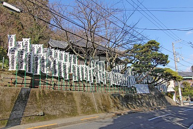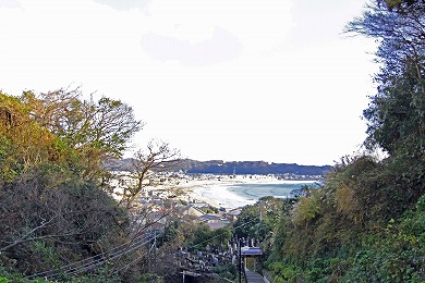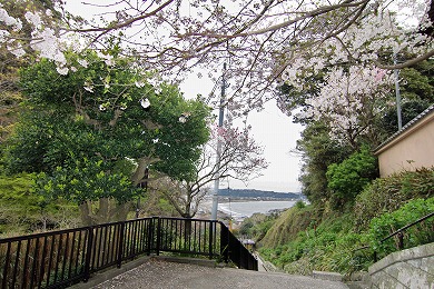 6月になると石段の両側には色とりどりのアジサイが咲きます。由比ヶ浜(ゆいがはま)や鎌倉の町が見下ろされ、見晴らしの良いところです。