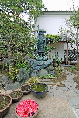 山門から中に入ると右側に弘法大師(こうぼうたいし)の名で知られる空海(くうかい)の大きな像がたっています。その奥に法隆寺(ほうりゅうじ)の夢殿を思わせる小さな八角堂があり、聖徳太子(しょうとくたいし)をまつっています。太子の1300年忌にあたる1921年(大正10年)に建てたそうです。