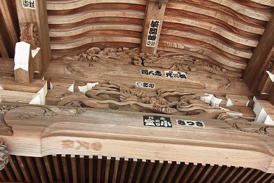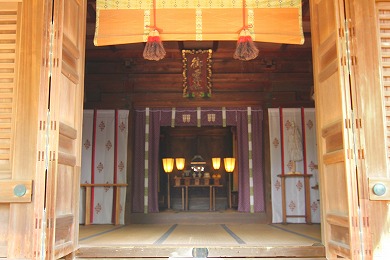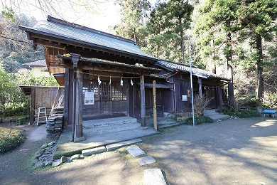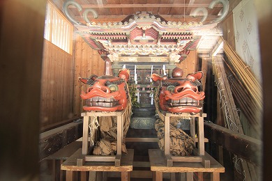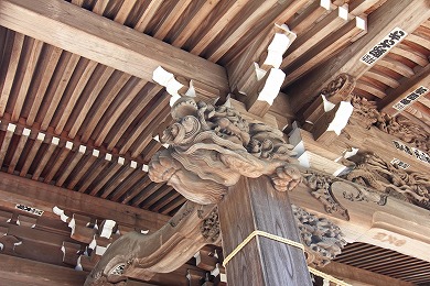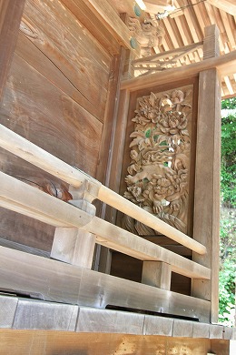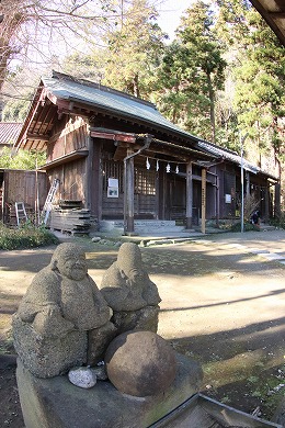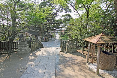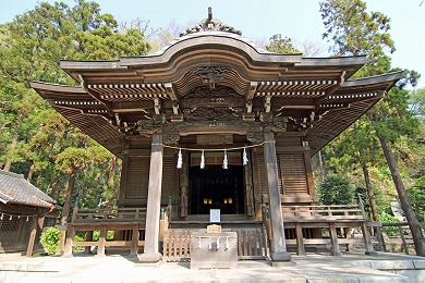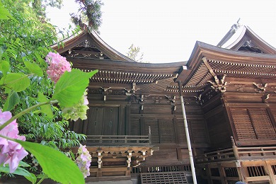 境内には、樹齢約350年、高さ20mのタブの木が高く枝を繁らせています。その下を進むと正面の石段があり、上がった所が社殿です。屋根には金色の二枚の矢羽根がついています。祭神である鎌倉権五郎景正の紋章が社紋となっていると伝えられています。拝殿の脇に彫刻があり、後ろの本殿にも豊かな彫刻がほどこされていて、立派な造りであることは、後ろに回るとよくわかります。社殿に向かって右側に、「景正の袂石(たもといし)」(約38kg)や「景正の手玉石(てだまいし)」(約68kg)という丸い石があります。また、社殿の前には