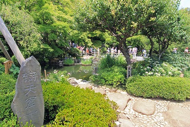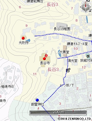 長谷寺は山号を海光山(かいこうざん)といいます。その由来は、流れ着いた観音像が海中で光を放っていたからともいいますが、海が見える所にある寺なのでそういったのかもしれません。長谷寺の始まりは、奈良時代の736年(天平8年)であろうと伝えられていますが、はっきりとはわかりません。ただ、長谷寺に伝わっている大きな梵鐘(ぼんしょう)にT文永元年」(1264年)の年号があることから、鎌倉時代には栄えていたといえまず。さらに、足利氏(あしかがし)や徳川家康(とくがわいえやす)らの信仰も伝えられ、江戸時代には関東の三十三か所の観音霊場の一つとして観音さまを巡ってお札を納めて歩く人が、江戸や近くの町から訪れてにぎわいました。今は観音堂をはじめりっぱな建物が次々と建てられ、大仏とならんで鎌倉の代表的な名所として、国内外の人々が訪れています。