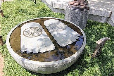 釈迦の足裏と法輪を彫った石。仏足石は仏像ができる以前から礼拝していました。