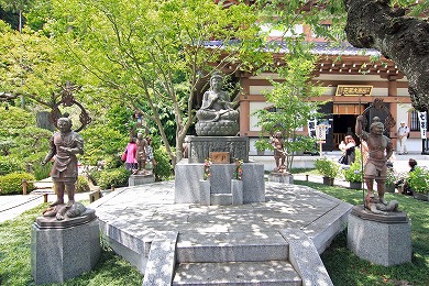 上の境内から石段を下り、池の石橋を渡って左へ進むと、左側に弁天堂(べんてんどう)、右側に慈光殿(じこうでん)があります。弁天堂には弘法大師(こうぼうだいし)が刻んだと伝えられる弁財天がまつられていましたが、その像は現在は宝物館に保管されています。弁天堂や慈光殿は写経の会場にもなっています。弁