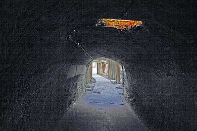 石の鳥居の奥の岩をくりぬいたトンネルをくぐり抜けると、たくさんの奉納された木の鳥居が並んでいる「銭洗弁財 宇賀福神社」の境内に出ます。