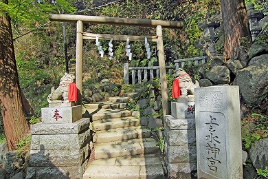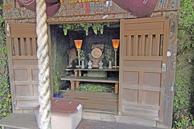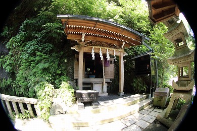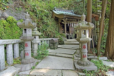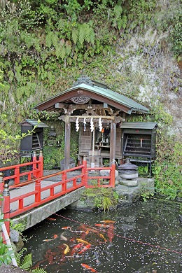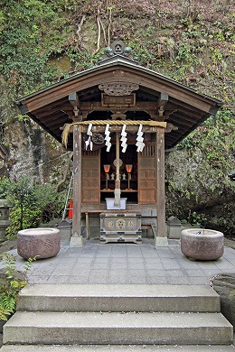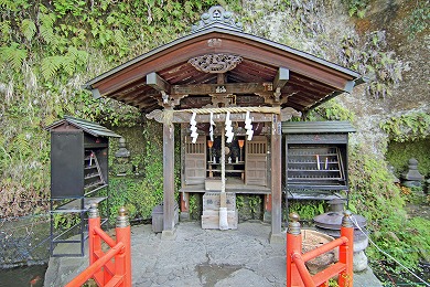 頼朝は洞くつを掘らせ、神社を建てて、夢に現われた宇賀福神をおまつりしました。そして、毎日その水を運んで供えたので、天下はしだいに治まり、盗賊(とうぞく)達もたちまち滅んで、人々は安楽な日々を送るようになったということです。