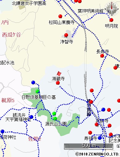 海蔵寺は臨済宗建長寺派の寺である。この寺は、1253年に鎌倉幕府六代将軍宗尊親王の命によって、藤原仲能(道知禅師)が願主となって、七堂伽藍の大寺を建立したが1333年5月、鎌倉滅亡の際の兵火によって全焼してしまった。