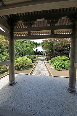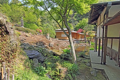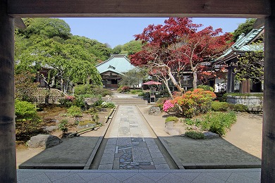 彫られた宇賀神(うがじん)で、弁財天(べんざいてん)が神仏一体となった宇賀福弁財天(うがふくべんざいてん)のご神体です。もとはここに字賀福弁財天をまつっていましたが、現在その弁財天は本堂に安置されています。やぐらの前を奥に行くと庭園が見え、「心字池(しんじいけ)」を中心にしています。
