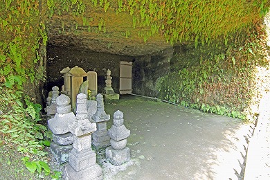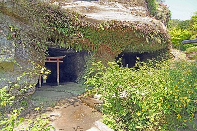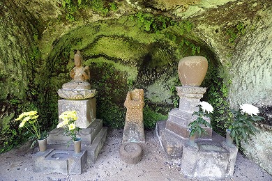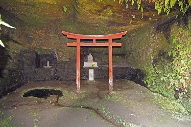 本堂の左側の奥の崖には、やぐらが四つあります。手前から三つ目と四つ目は大きなやぐらで、三つ目のやぐらは雨宝殿(うほうでん)と呼ばれています。やぐら内に立つ朱塗りの鳥居をくぐると、奥の一段高くなったところに高さ50~60cmの石像があり、翁に蛇がとぐろを巻いているように