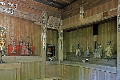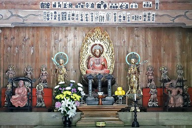 薬師如来は仏殿の本尊で別名・啼(なき)薬師または児護薬師ともいわれ、胎内には土中から発掘されたという古い仏面を収めている。