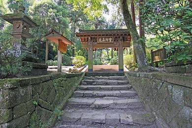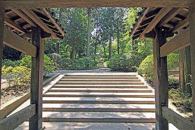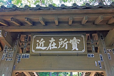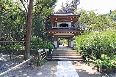 無学祖元の書といわれる「賓(宝)所在近(ほうしょざいきん)」の額を掲げた総門をへて、林の中の参道を進むと石段があり、その上に山門があります。山門は、上に鐘楼があるめずらしいもので1679年(延宝7年)の銅鐘がかかっています。山門をくぐり進む