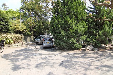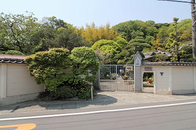 道路より奥まった所に徳川家の三葉葵(みつばあおい)の紋をつけた屋根を持つ総門があり、その両側に屋根瓦(がわら)をのせた塀(へい)が続いています。白線を入れたこの塀は格式の高い寺ということを表わしています。昔、水戸御殿(ごてん)といわれたほどのところです。この総門は英勝院の命日など特別なときだ