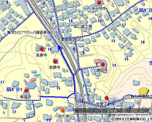 寿福寺(じゅふくじ)の門の前に庚申塔(こうしんとう)があります。中には「寛文八年」(1668年)の年号のあるものや「川上 藤沢宿」「川下 八幡(はちまん)」と道しるべになっているのもあります。その横に小さい川が流れていますが、道幅を広げるため、川の一部をおおったつくりになっています。昔はもう少し大きい川で、ここに鎌倉十はし(じっっきょう)の一つの「勝ノ橋」がかけられていました。英勝寺(えいしょうじ)を開いたお勝(かつ)の局(つぼね)にちなんでそう名付けられたといわれますが、はっきりしたことはわかりません。明治の末ごろまでは中央が盛り上がったりっぱな形でしたが、今は庚申塔(こうしんとう)の横に「勝ノ橋」という石柱と敷石一枚が立ててあります。この他の石材は英勝寺の庭園内に置かれています。