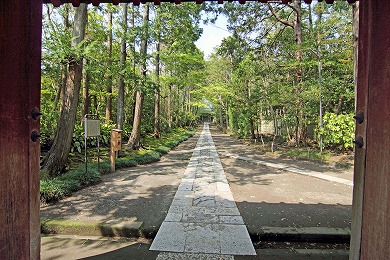 源氏山を後ろにしたこの寺は、朱塗りの総門をくぐると、木立に囲まれた石だたみの参道がまっすぐに続き、山門のむこうに大きなビャクシン(ヒノキ科の針葉樹)が枝を広げ、禅寺(ぜんでら)の雰囲気をただよわせています。