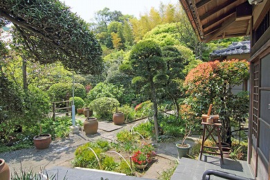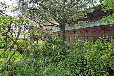 カエデがあります。その奥には、公開されていませんが茶室や梅・カエデ・ツツジなどが植えられた庭があり、沢庵和尚(たくあんおしょう)の文字や三葉葵門(みつばあおいもん)のついた水盤などがあります。
