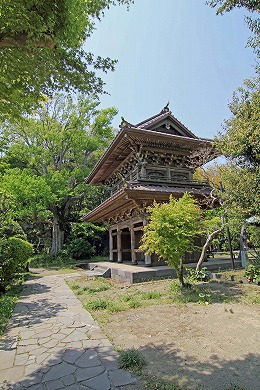 総門のそばに、袴(はかま)の腰の部分の台形のように下部が広がった「袴腰(はかまごし)」という形の黒い鐘楼(しょうろう)があります。「袴腰」の鐘楼があるのは、鎌倉では英勝寺だけです。英勝寺の鑓は、1643年(寛永20年)、長谷川重次(しげつぐ)の作で、江戸時代の有名な学者の