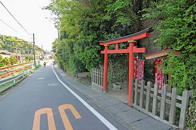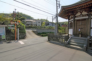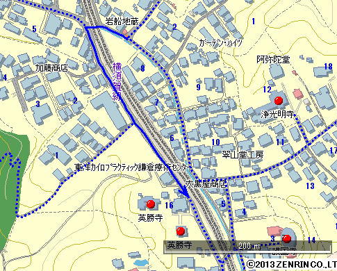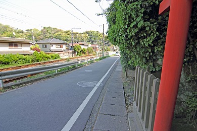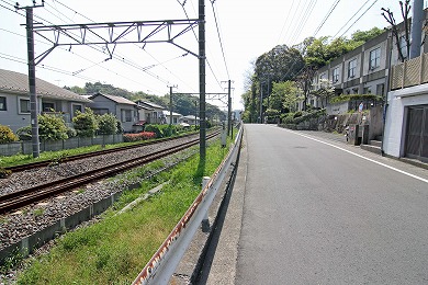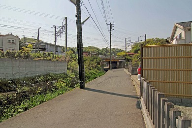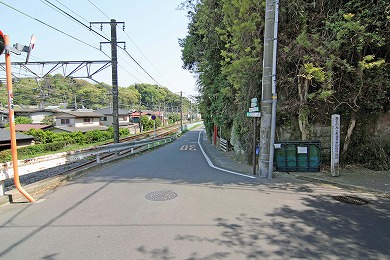 横須賀線のガードをくぐります。このあたりの谷は、関東十刹(じっさつ)に数えられていた法泉寺(ほうせんじ)という大きな寺があったので、法泉寺ヶ谷(ほうせんじがやつ)と呼ばれています。