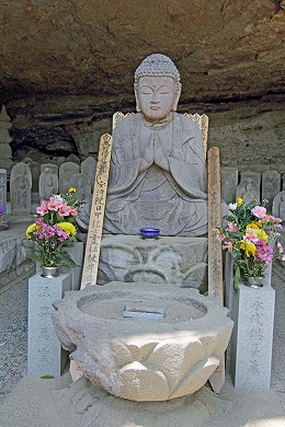 石像は、どんな材質のものでもだんだんとけていくのだそうです。現在、やぐらの入口近くに4体の石像が並んでいますが、どれも像の輪郭がわからないくらいにとけています。このあたりは海底が隆起(りゅうき)したところなので、塩分の影響が大きいのではないかと考えられています。