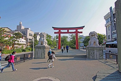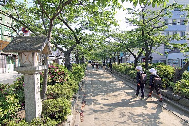 道幅は八幡宮に近づくにしたがって狭くていますし、石績みも少しずつ低くなっていす。昔は海から見れば八幡宮がより遠くにおごそかに見えたことでしょう。改修や鉄道の開通、桜の植樹などで、大正時代以後に、ほぼ今のような道になりました。