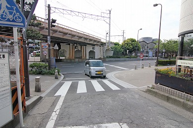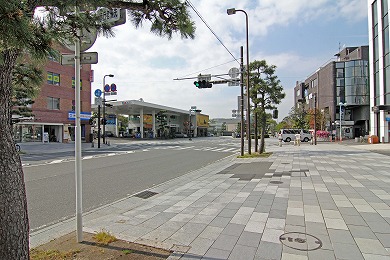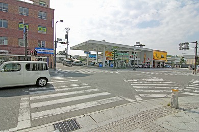 交差点を渡ります。左斜め前方のガソリンスタンド方向に行きます。