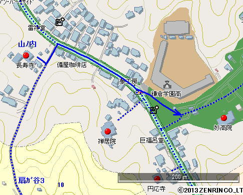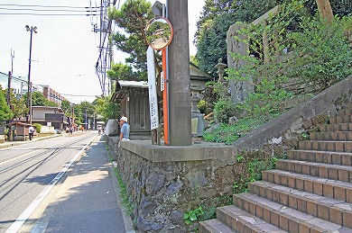 長寿寺(ちょうじゅじ)からバス通りを鎌倉方面に70mほどいくと、右側に石碑と鳥居があり、高い石段が山の斜面に続いているのが見えますが立ち入ることはできません。この上には、建長寺の四方鎮守(ちんじゅ)の一つで、天神七代の第六天神である国之常立命(くにのとこたちのみこと)をまつる第六天社があり