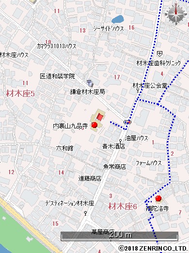 鎌倉では唯一の義貞が建立した寺で、山門の「内裏山」、本堂の「九品寺」の掲額は、義貞の筆蹟と伝えられている。