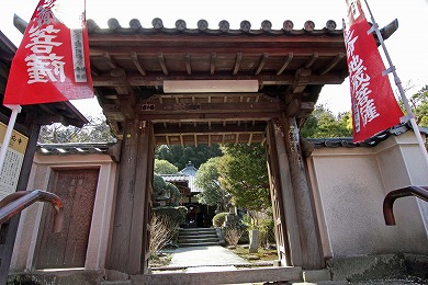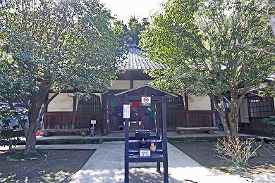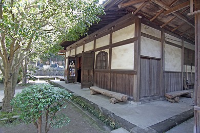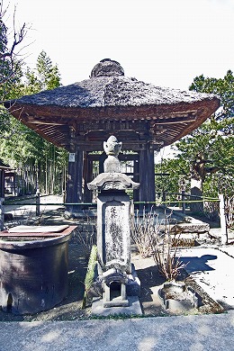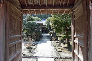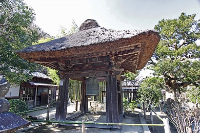 境内には、瓦葺く(かわらぶき)の仏殿と、その右側に庫裡(くり)、手前に茅葺(かやぶき)の鐘楼(しょうろう)が並びます。