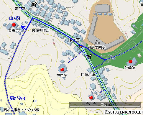 建長寺を出、右方向へ(北鎌倉駅方向)。