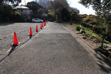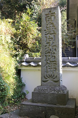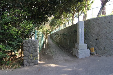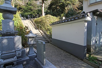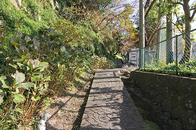 左手に鎌倉市立第一中学校があります。その校庭の石垣の脇に「良忠上人御廟(りょうちゅうしょうにんごびょう)参道」」の石碑があります。