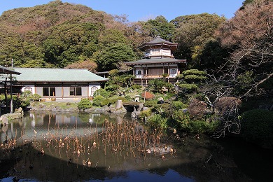 本堂に向かって左手にあるハス池の庭園は、開山ゆかりの記主庭園(きしゅていえん)で、江戸時代の茶人で将軍や大名などに茶の湯を教え、また江戸幕府の作事奉行(さくじぶぎょう)として、名古屋城天守閣や二条城二の丸などの大工事を担当した小堀遠州(こぼりえんしゅう)の作った庭ともいわれていますが、