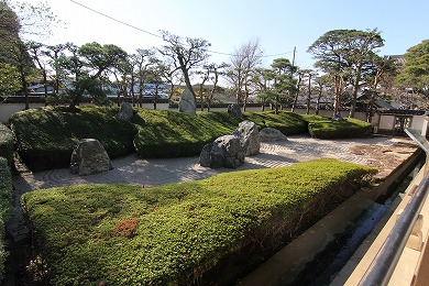 本堂に向かって右手には、「三尊五祖来迎(さんそんごそらいごう)の庭」があり、本堂に上がって見ることができます。