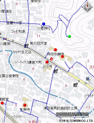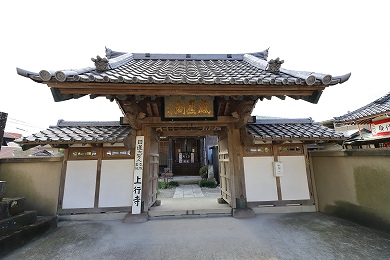 上行寺は、日範(にちはん)が1313年(正和2年)に創建したといわれる日蓮宗(にちれんしゅう)の寺で、山号は法久山(ほうきゅうざん)といいます。現在の本堂は1886年(明治19年)に、名越松葉ヶ谷(なごえまつばがやつ)の妙法寺(みょうほうじ)の法華堂(ほっけどう)を移築したものといわれています。本堂の中は公開されていませんが、その格天井(ごうてんじょう)には美しい花鳥の絵が、表の欄間には十二支の彫刻がほどこされています。
