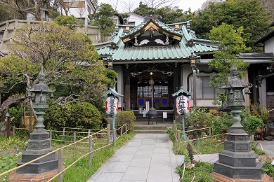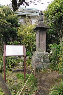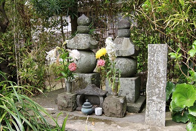 本堂左手横には、一説に比企能本(ひきよしもと)夫人の姉とも伝えられている桟敷尼(さじきに)と、寺の伝えでは鎌倉幕府6代将軍の宗尊親王(むねたかしんのう)の家臣の印東次郎左衛門尉祐信(いんどうじろうざえもんのじょうすけのぶ)、資料では兵衛左衛門という桟敷尼の夫の墓といわれる石塔があります。