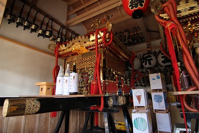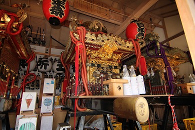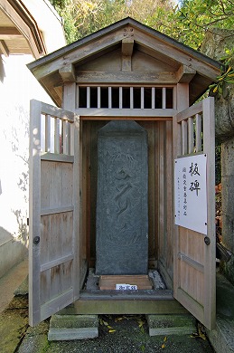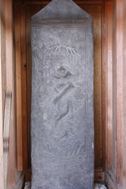 神輿庫の右手の小さな建物には「弘長二年」(1262年)の年号が刻まれた板碑が完全な姿で残され、鎌倉時代の貴重なものです。この板碑は、実相寺(じっそうじ)の南に建っていて廃寺(はいじ)になった観応寺(かんのうじ)にあったものだといわれます。