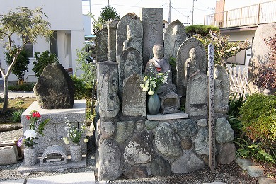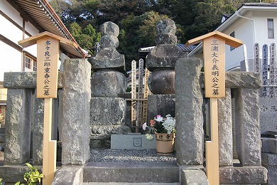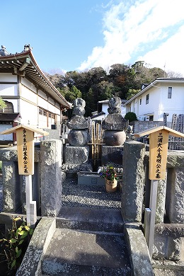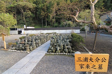 本堂裏手の広場には、「三浦大介公の家来の墓」と表示された100数基の小さな五輪塔などが並んでいます。また、来迎寺会館の中には三浦義明の木像が安置されています。