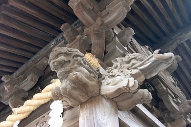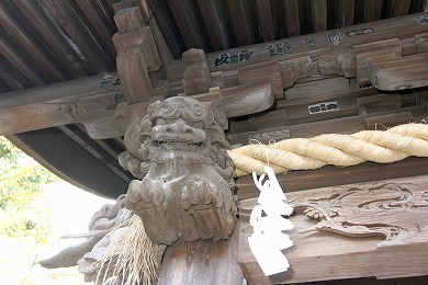 山門の柱の木鼻(きばな)には、象や唐獅子(からじし)の彫り物、山門の欄間(らんま)にはこれも唐獅子やキリンの浮き彫りがみられます。