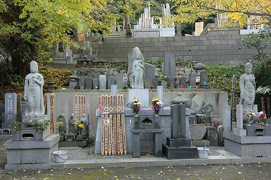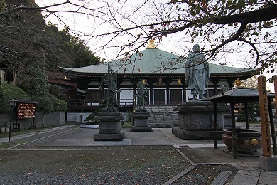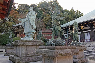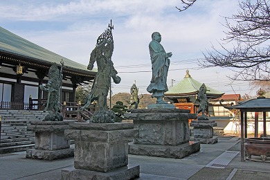 帝釈堂の前に台座を含む高さが約8mもある大きな日蓮の銅像が立っています。この銅像は近代日本の代表的な彫刻家の高村光雲(たかむらこううん)の作です。東京の洗足池(せんぞくいけ)のほとりから長勝寺裏山の墓地内に移され、今は帝釈天や仏の世界を守る持国天(じこくてん)・増長天(ぞうちょうてん)・広目天