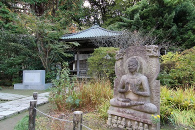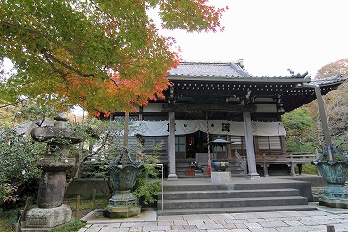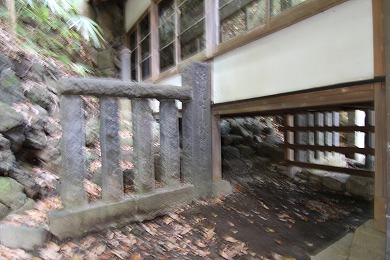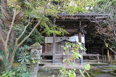 本堂の前面に御小庵(ごしょうあん)があります。法窟の前に法窟と渡り廊下の建物でつながって建てられているお堂です。御小庵の始まりは、1260年(文応元年)に焼き討ちされた日蓮の草庵の跡に、日蓮の