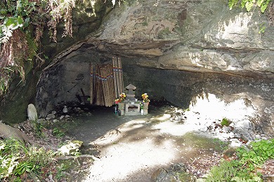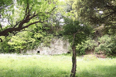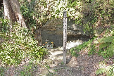 東勝寺跡の前の道をさらに谷の奥に入ると、「東勝寺旧蹟」の史跡案内の石碑があり、そのすぐ左手に「高時の腹切りやぐら」があります。中には石を積んだ高時の墓と伝えられる五輪塔が、寄せ集めですが立っています。