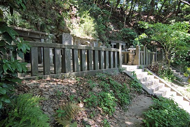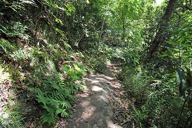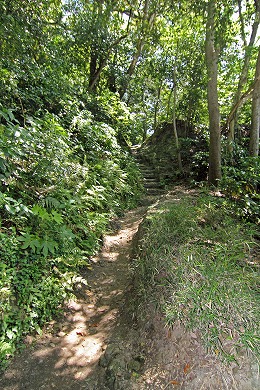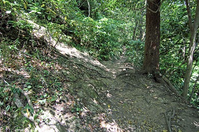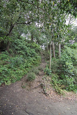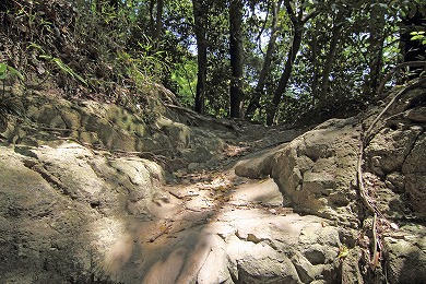 右の写真の急坂を上ります。道が濡れていると滑りますので、注意。