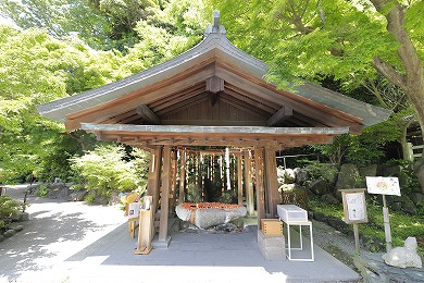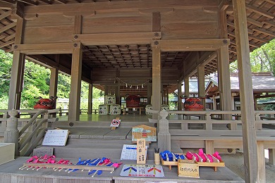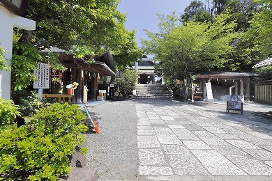 白い大鳥居をくぐると、入母屋造りの拝殿があります。拝殿の右側の宝仏殿には、御祭神として護良親王像が収められ、八月二十日には、護良親王にちなんで毎年、例祭が行われています。