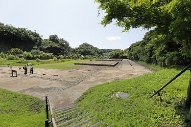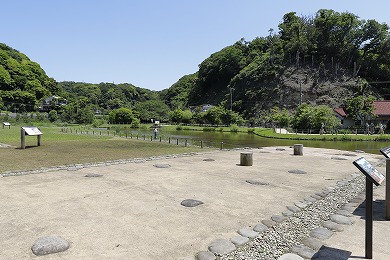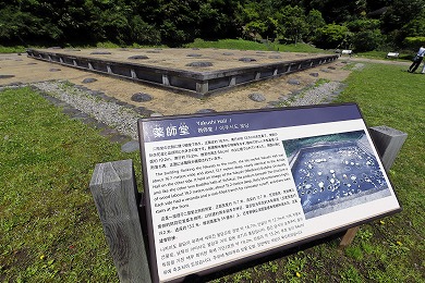 二階堂の北側に立つ脇堂であり、正面は約16.7m、奥行きが2.7mの本瓦葺きで、南側の阿弥陀堂とほぼ同じ大きさの堂です。創建時永福寺の特徴をなす、極めて珍しい木製基壇(正面19.2m、奥行15.2m、推定の高さ54cm)の上に建てられていました。周囲に緑と雨落ち溝、正面に階段が確認されています。(案内看板より)
