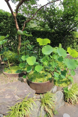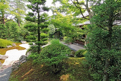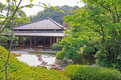 枯山水のお庭を見ながらお抹茶がいただけます(有料)。現在の茶室は1991年に復興したものです