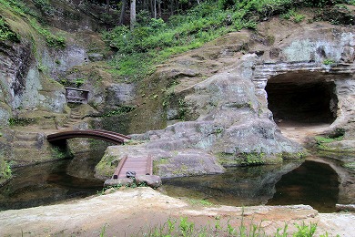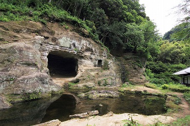 後ろの山から泉水(せんすい)を引いて岩盤を